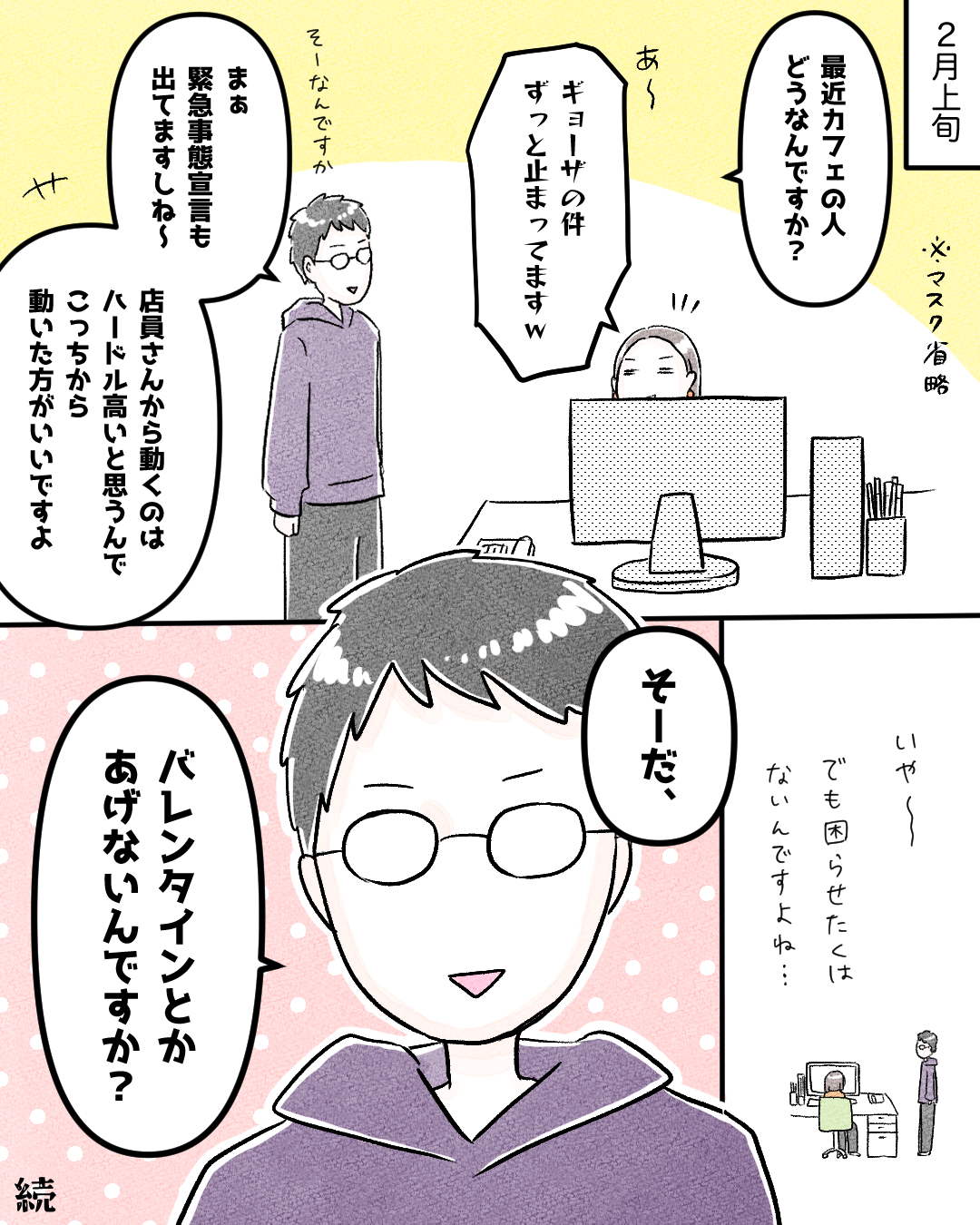 スポンサーリンク おすすめ記事スマホに人生食われるところだった❶推しカフェ店員さんがいた日々【42】推しカフェ店員さんがいた日々【41】推しカフェ店員さんがいた日々【40】推しカフェ店員さんがいた日々【39】 推しカフェ店員さんがいた日々【42】 エッセイ漫画 2026.03.20 スポンサーリンク 本当はこの話は、2月頃に載せられたらよかったんだけど 気づけば3月🥲 42話 広告 広告 広告 ひとこと こんな話ばっかしてたなw 296